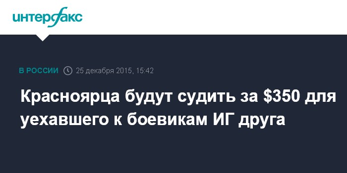 Москва. 25 декабря. INTERFAX.RU - Московский окружной военный суд рассмотрит дело жителя Красноярска, обвиняемого в содействии террористической деятельности за то, что он дал деньги своему другу, который собирался в Сирию воевать на стороне запрещенного в РФ "Исламского государства", сообщает пресс-служба прокуратуры Красноярского края.