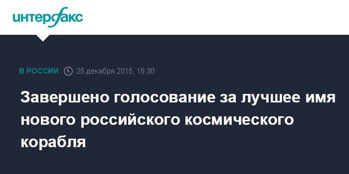 Москва. 25 декабря. INTERFAX.RU - Завершилось общественное голосование за лучшее название нового российского пилотируемого транспортного корабля (ПТК) нового поколения разработки РКК "Энергия", сообщает пресс-служба корпорации.
