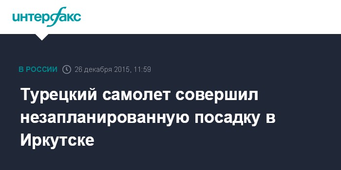 Москва. 26 декабря. INTERFAX.RU - Самолет турецкой авиакомпании в субботу совершил незапланированную посадку в аэропорту Иркутска, сообщил "Интерфаксу" источник в аэропорту.