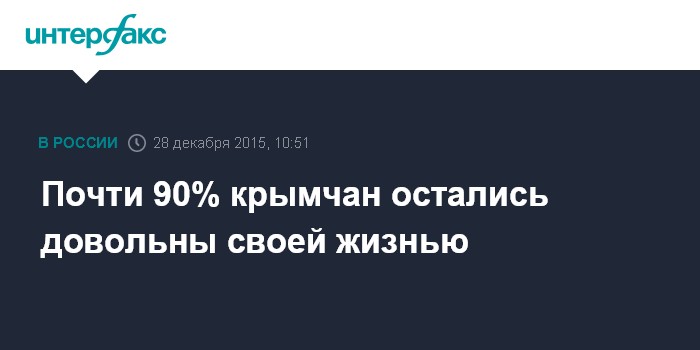 Москва. 28 декабря. INTERFAX.RU - Подавляющее большинство крымчан (89%) говорят, что живут довольно хорошо, недовольство своей жизненной ситуацией выражает каждый десятый (10%). Такие данные получили социологи ВЦИОМ по итогам опроса, проведенного в Крыму среди 1000 человек 23-26 декабря.