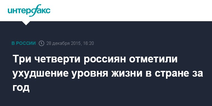 Москва. 28 декабря. INTERFAX.RU - Большинство россиян считают, что уходящий год оказался труднее, чем предыдущий, и в целом для страны (60%), и лично для них самих (55%), а 75% полагают, что уровень жизни большинства населения России изменился к худшему, сообщили "Интерфаксу" в "Левада-Центре".