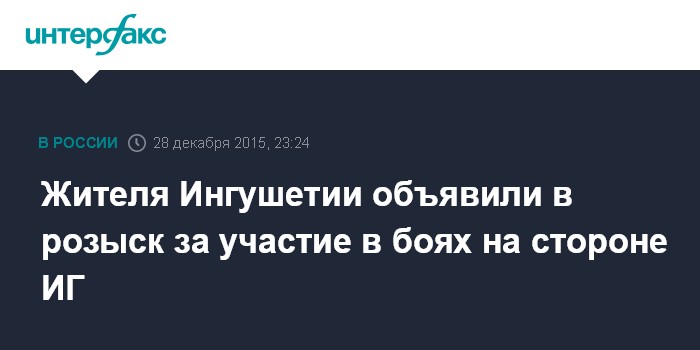 Москва. 28 декабря. INTERFAX.RU - Правоохранительные органы Ингушетии объявили в розыск местного жителя 27 лет за участие в боевых действиях в Сирии на стороне запрещенной в РФ террористической группировки "Исламское государство" (ИГ), сообщило республиканское управление СКР.