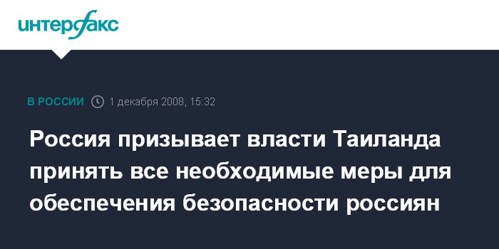 Москва. 1 декабря. INTERFAX.RU - Россия призывает власти Таиланда обеспечить безопасность граждан РФ, оказавшихся в этой стране, сообщает МИД РФ. Как говорится в сообщении российского внешнеполитического ведомства, распространенном в понедельник, 1 декабря в МИД РФ был приглашен посол Таиланда в Москве Сулпот Тиракаосан.