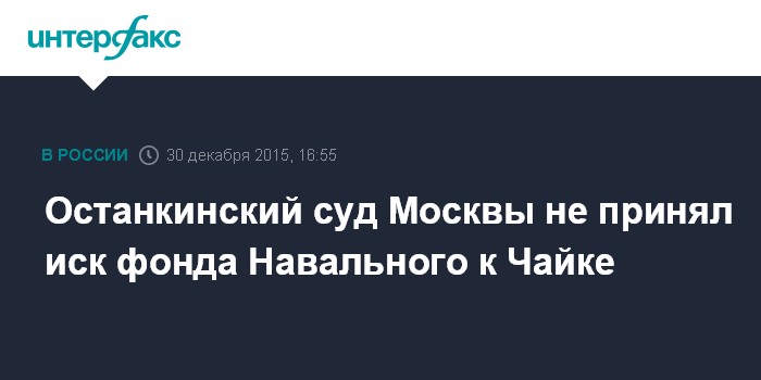 Москва. 30 декабря. INTERFAX.RU - Останкинский суд Москвы отказался принять иски Фонда борьбы с коррупцией (ФБК) Алексея Навального к генпрокурору Юрию Чайке и средствам массовой информации.