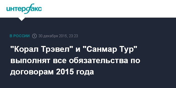 Москва. 30 декабря. INTERFAX.RU - Туроператоры "Корал Трэвел" и "Санмар Тур" выполнят все обязательства перед партнерами и туристами по договорам, заключенным до 1 января 2016 года, сообщила "Интерфаксу" в среду глава отдела по связям с общественностью компаний Марина Макарова.