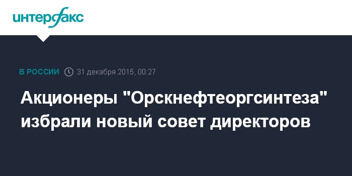 Москва. 31 декабря. INTERFAX.RU - Акционеры ОАО "Орскнефтеоргсинтез" (Орский НПЗ) на внеочередном собрании 28 декабря досрочно прекратили полномочия членов совета директоров и избрали новый состав совета, говорится в сообщении компании.
