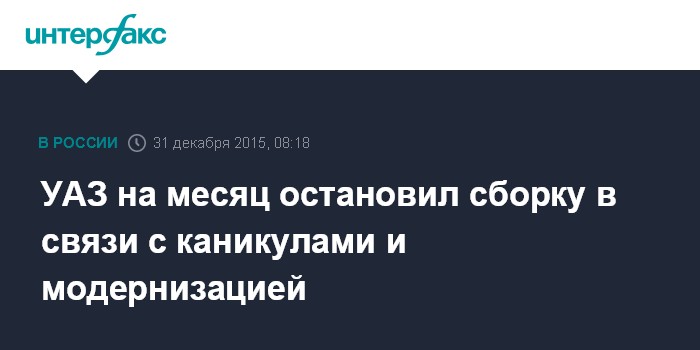 Москва. 31 декабря. INTERFAX.RU - АО "Ульяновский автомобильный завод" ("УАЗ", входит в группу Sollers) в период с 31 декабря 2015 года по первое февраля 2016 года приостанавливает выпуск автомобилей в связи с корпоративным отпуском и модернизацией производственной площадки, сообщили "Интерфаксу" в пресс-службе предприятия.