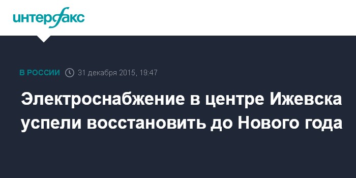 Москва. 31 декабря. INTERFAX.RU - Электричество в полусотне домов в центре Ижевска, оставленных без света в результате аварии в четверг вечером, восстановлено, сообщили "Интерфаксу" в информационно-диспетчерской службе города.