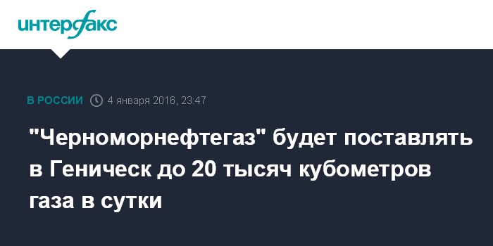 "Мы получили запрос на поставку газа в город Геническ, поскольку мощностей газотранспортной системы Украины недостаточно для отопления города и района Геническа. Мы переадресовали этот вопрос в вышестоящие органы власти РФ и получили указание осуществить поставку. Сегодня в 22:40 мск газ в город Геническ подан", - сообщил Шабанов.