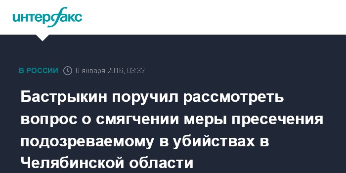 Москва. 6 января. INTERFAX.RU - На время расследования уголовного дела по факту убийства четырех человек в Челябинской области председатель СК РФ Александр Бастрыкин поручил руководителю следственного управления по Челябинской области рассмотреть возможность избрания в отношении подозреваемого более мягкой меры пресечения, например, в виде домашнего ареста, сообщил официальный представитель СК РФ Владимир Маркин.