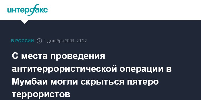 Москва. 1 декабря. INTERFAX.RU - Не менее пяти налетчиков, участвовавших в терактах в индийском городе Мумбаи (Бомбее), смогли скрыться во время операции индийского спецназа. Такое мнение высказали в понедельник представители индийской полиции.
