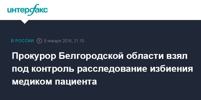 Москва. 9 января. INTERFAX.RU - Прокурор Белгородской области взял под личный контроль расследование гибели одного из пациентов горбольницы №2, которого избил врач, сообщила "Интерфаксу" представитель областной прокуратуры Ольга Моисейкина.