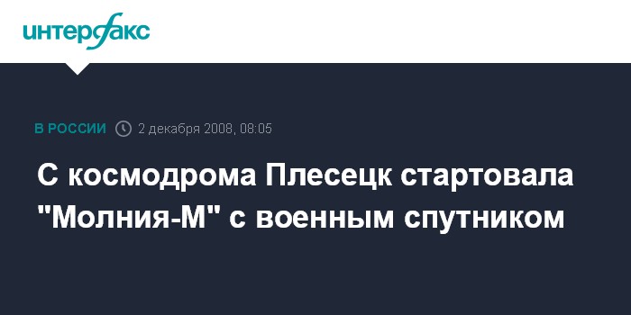 Москва. 2 декабря. INTERFAX.RU - Стартовые расчеты Космических войск РФ утром во вторник осуществили с космодрома Плесецк (Архангельская область) пуск ракеты-носителя среднего класса "Молния-М" со спутником военного назначения, сообщил "Интерфаксу-АВН" помощник командующего Космическими войсками подполковник Алексей Золотухин.