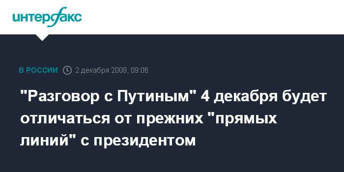 Москва. 2 декабря. INTERFAX.RU - Специальная программа "Разговор с Владимиром Путиным", которую 4 декабря в полдень начнет в прямом эфире транслировать холдинг ВГТРК, будет заметно отличаться по своему формату от "прямых линий", которые Путин проводил в качестве главы государства.