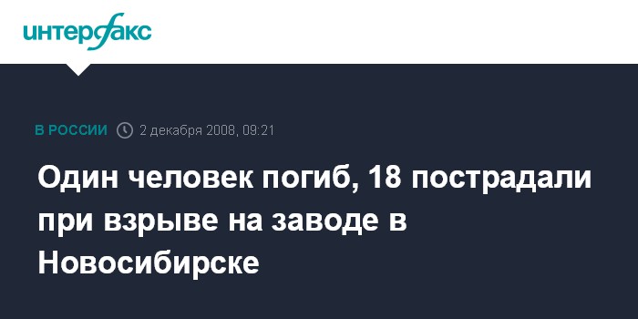 Новосибирск. 2 декабря. INTERFAX.RU - В результате взрыва, произошедшего во вторник на Новосибирском заводе искусственного волокна (Новосибирск), один человек погиб, 18 получили травмы, сообщил агентству "Интерфакс-Сибирь" в правоохранительных органах региона.