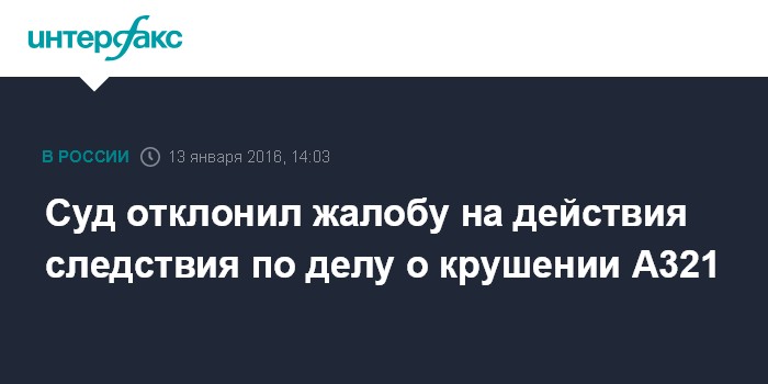 Москва. 13 января. INTERFAX.RU - Басманный суд Москвы признал законными действия следствия в связи с расследованием авиакатастрофы над Египтом самолета "Когалымавиа" A321, в которой погибли 224 человека.