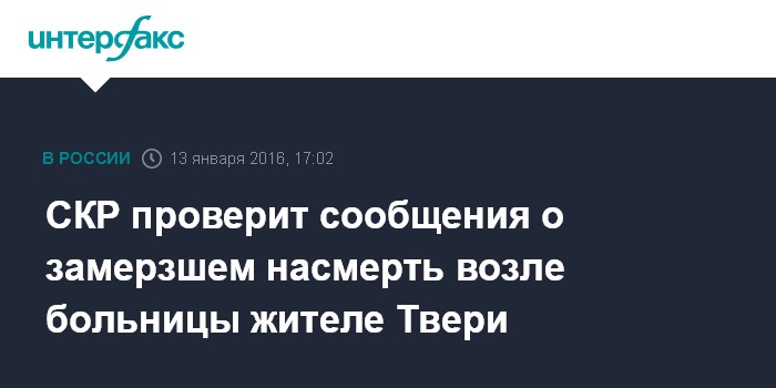 Москва. 13 января. INTERFAX.RU - СУ СКР по Тверской области начало доследственную проверка после размещения на сайте одного из изданий публикации о том, что в поселке Химинститута (Тверь) 57-летний мужчина умер на морозе после того, как ему на помощь отказались ехать медики.
