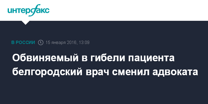 Москва. 15 января. INTERFAX.RU - Врач Илья Зелендинов, от удара которого погиб мужчина в городской больнице N2 Белгорода, решил заменить адвоката, который первоначально защищал его интересы. Об этом в пятницу "Интерфаксу" сообщил защитник Сергей Кривородько.