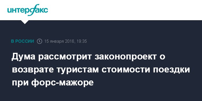 Москва. 15 января. INTERFAX.RU - В Государственную думу внесен проект закона, предлагающий обязать туроператора полностью возвращать туристу стоимость поездки в случае возникновения в стране пребывания форс-мажорных обстоятельств, таких как, к примеру, землетрясение или теракт.