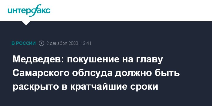 Москва. 2 декабря. INTERFAX.RU - Президент России Дмитрий Медведев потребовал в кратчайшие сроки раскрыть покушение на председателя Самарского областного суда Любовь Дроздову и найти виновных в этом преступлении.