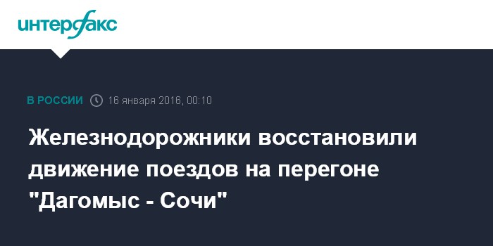 Москва. 16 января. INTERFAX.RU - Движение поездов на железнодорожном перегоне "Дагомыс - Сочи" полностью восстановлено после падения деревьев на железнодорожные пути, сообщили агентству "Интерфакс" в ГУ МЧС РФ по Краснодарскому краю.