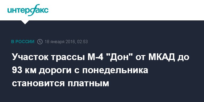 Москва. 18 января. INTERFAX.RU - Участок автодороги М-4 "Дон" в Московской области (21-й км - 93-й км) станет платным с 18 января, говорится в сообщении ГК "Автодор".