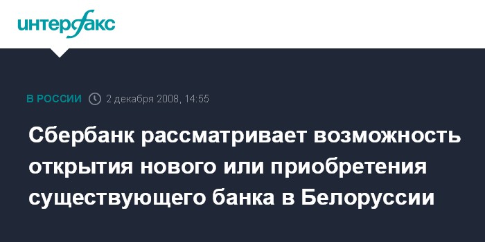 Москва. 2 декабря. INTERFAX.RU - Сбербанк Российской Федерации в ближайшее время рассмотрит возможность открытия нового или приобретения существующего в Белоруссии банка, заявил председатель правления Сбербанка Российской Федерации Герман Греф журналистам во вторник в Минске после встречи с президентом Александром Лукашенко.
