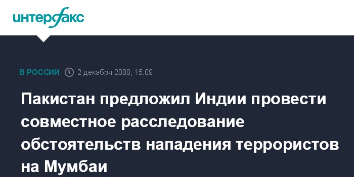Москва. 2 декабря. INTERFAX.RU - Власти Пакистана предложили Индии создать совместную комиссию для расследования обстоятельств нападения террористов на индийский город Мумбаи.