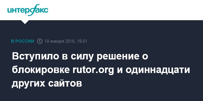 Москва. 19 января. INTERFAX.RU - Первое решение о пожизненной блокировке сайта rutor.org и одиннадцати других ресурсов, недобросовестно распространявших интернет-контент, вступило в законную силу.