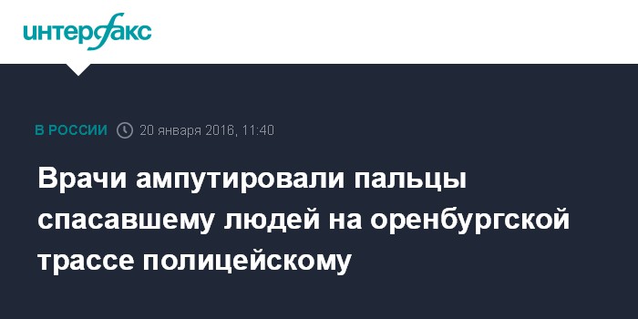 Москва. 20 января. INTERFAX.RU - Сотруднику ППС полиции Медногорска Оренбургской области Данилу Максудову, отдавшему во время спасательной операции на трассе "Оренбург-Орск" одежду замерзающим людям и получившему обморожение рук, пришлось провести частичную ампутацию пальцев.