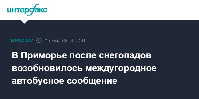 Москва. 21 января. INTERFAX.RU - Рейсы междугородных автобусов из Владивостока, отмененные ранее из-за снежного циклона, выполняются по расписанию.