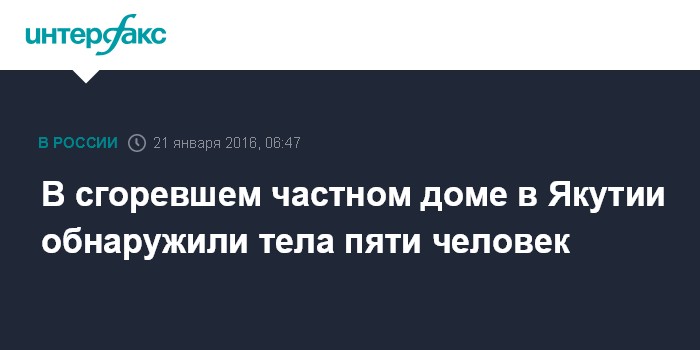 Москва. 21 января. INTERFAX.RU - Женщина с четырьмя детьми погибли при пожаре в частном доме в якутском селе Абый.