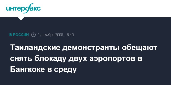 Москва. 2 декабря. INTERFAX.RU - Сторонники оппозиционного Народного альянса за демократию снимут в среду блокаду с двух аэропортов Бангкока - Суварнабхуми и Донмуанг - заявил один из руководителей партии Сонти Лимтхонкхун. Он также призвал своих сторонников прекратить протесты - по крайней мере, на время.