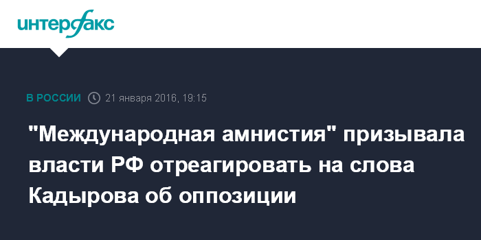 Москва. 21 января. INTERFAX.RU - Правозащитная организация "Международная амнистия" (Amnesty International) призвала власти Российской Федерации отреагировать на недавние заявления руководства Чечни в адрес правозащитников, журналистов и оппозиционеров.