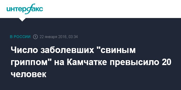 Москва. 22 января. INTERFAX.RU - По состоянию на 22 января на Камчатке зарегистрировано более 20 случаев гриппа H1N1, сообщает в пятницу министерство здравоохранения Камчатского края.