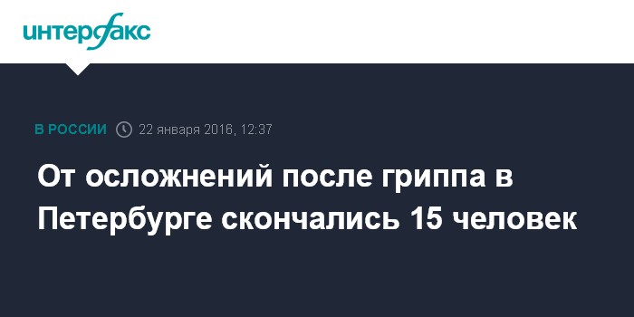 Москва. 22 января. INTERFAX.RU - Осложнения, вызванные гриппом и простудными заболеваниями, привели к гибели 15 жителей Санкт-Петербурга, сообщил "Интерфаксу" источник в медицинских кругах города в пятницу.