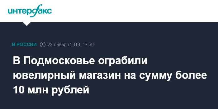 В свою очередь, в пресс-службе ГУ МВД России по Московской области "Интерфаксу" рассказали, что ограбление в городе Домодедово произошло сегодня утром на улице Кирова. "Около 10:00 двое неизвестных в масках вошли в ювелирный магазин, расположенный на улице Кирова и, угрожая сотруднице магазина оружием, открыто похитили ювелирные изделия и деньги, после чего скрылись", - сказал сотрудник пресс-службы.
