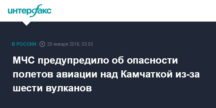 Москва. 25 января. INTERFAX.RU - Опасность для авиационных полетов сохраняется в районе шести вулканов Курило-Камчатской гряды, сообщает в понедельник пресс-служба ДВРЦ МЧС России.