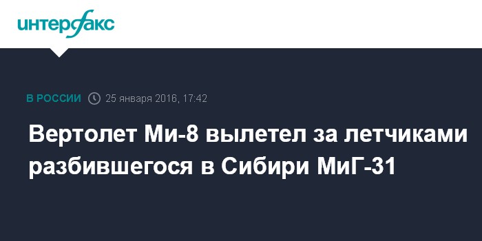 Москва. 25 января. INTERFAX.RU -Вертолет регионального координационного поисково-спасательного центра вылетел за летчиками рухнувшего самолета в Красноярском крае МиГ-31, сообщил источник в оперативных службах края.