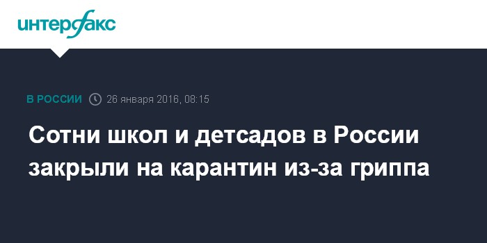 Москва. 26 января. INTERFAX.RU - Более 800 школ закрыто в России на карантин из-за увеличения заболеваемости гриппом и ОРВИ, сообщила "Интерфаксу" во вторник руководитель Роспотребнадзора, главный государственный санитарный врач РФ Анна Попова.