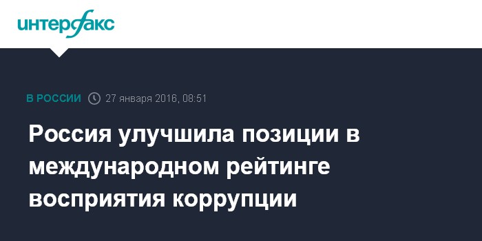 Москва. 27 января. INTERFAX.RU - Россия в 2015 году улучшила свои позиции в глобальном рейтинге Transparency International, который оценивает уровень восприятия коррупции в разных странах мира.
