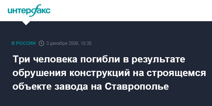 Москва. 3 декабря. INTERFAX.RU - В результате обрушения бетонных конструкций на территории Красногвардейского стеклотарного завода в Ставропольском крае три человека погибли, один получил ранения.