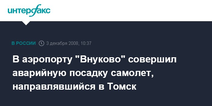 Москва. 3 декабря. INTERFAX.RU - Самолет, направлявшийся из Москвы в Томск, совершил аварийную посадку в аэропорту "Внуково", совершил "Интерфаксу" источник в правоохранительных органах в среду.