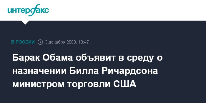 Москва. 3 декабря. INTERFAX.RU - Избранный президент США Барак Обама в среду объявит о назначении губернатора штата Нью-Мексико Билла Ричардсона на пост министра торговли США, сообщает газета "Вашингтон пост".