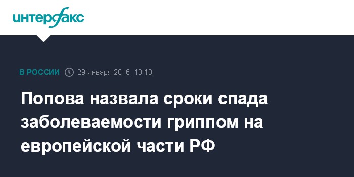 Москва. 29 января. INTERFAX.RU - Снижение заболеваемости гриппом и ОРВИ в Москве и других городах европейской части России ожидается в середине или в конце февраля, заявила "Интерфаксу" в пятницу руководитель Роспотребнадзора, главный государственный санитарный врач РФ Анна Попова.