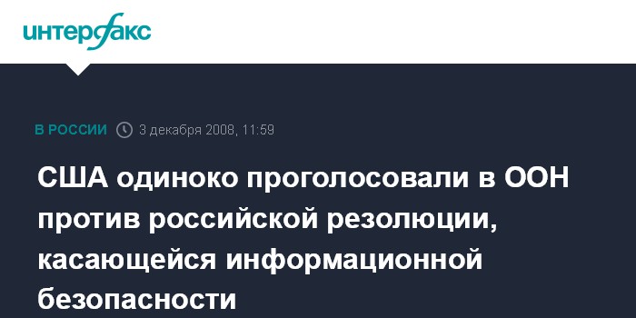 Москва. 3 декабря. INTERFAX.RU - США - единственные из стран-членов ООН проголосовали против инициированной Россией резолюции "Достижения в сфере информатизации и телекоммуникаций в контексте международной безопасности". За принятие этого документа на пленарном заседании 63-й сессии Генассамблеи ООН проголосовали 167 государств, воздержавшихся не было, сообщила в среду служба новостей ООН.