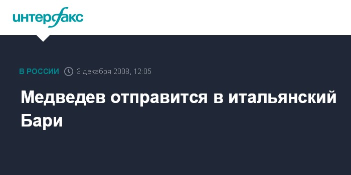 Москва. 3 декабря. INTERFAX.RU - Президент РФ Дмитрий Медведев посетит Италию (город Бари) с рабочим визитом 6 декабря, сообщили "Интерфаксу" в пресс-службе Кремля.