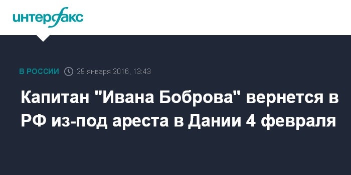 Москва. 29 января. INTERFAX.RU - Капитан сухогруза "Иван Бобров" будет депортирован из Дании в РФ 4 февраля, сообщила "Интерфаксу" коммерческий директор компании-судовладельца "Транс-НАО Шиппинг Компани" Светлана Зеленцова.