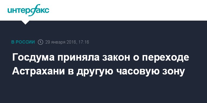 Москва. 29 января. INTERFAX.RU - Госдума приняла в третьем чтении закон о переводе Астраханской области из московского часового пояса (вторая часовая зона, МСК, UTC+3) в третью часовую зону (МСК+1, UTC+4).