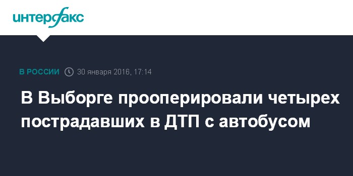 Москва. 30 января. INTERFAX.RU - Четверо пострадавших в ДТП на трассе "Скандинавия" в Ленинградской области в субботу были прооперированы врачами в больнице Выборга, сообщил журналистам главный хирург Ленинградской области Олег Эргашев.